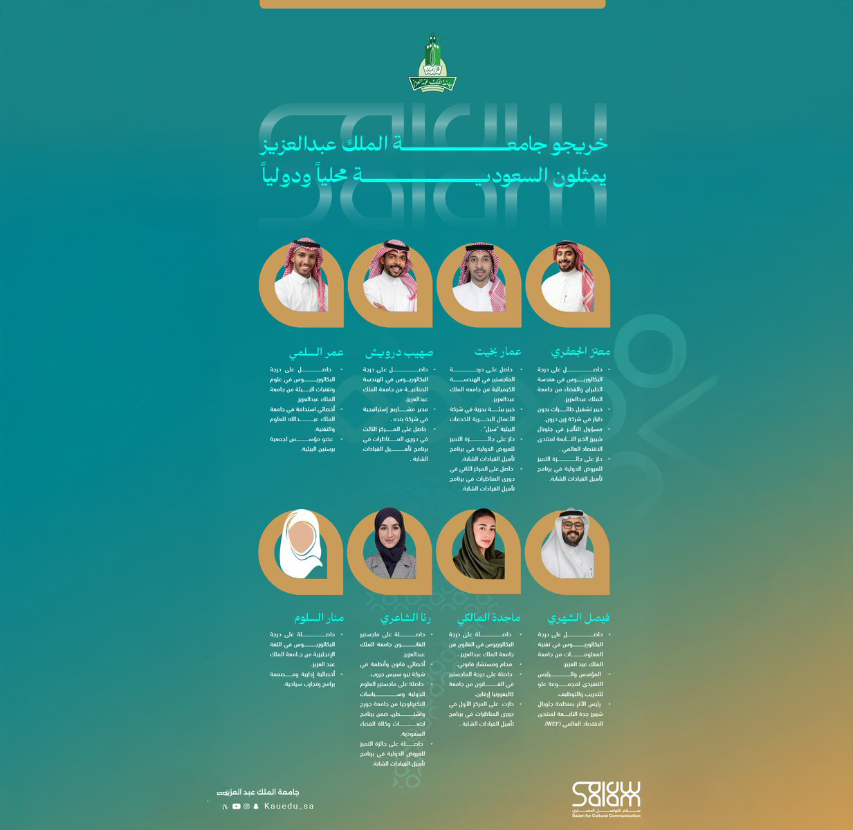 King Abdulaziz University strives to provide an exceptional academic and research environment that empowers generations to face challenges and lead the future. Through advanced educational programs and global partnerships, we aim to foster innovation and develop scientific research to serve the community and the nation.